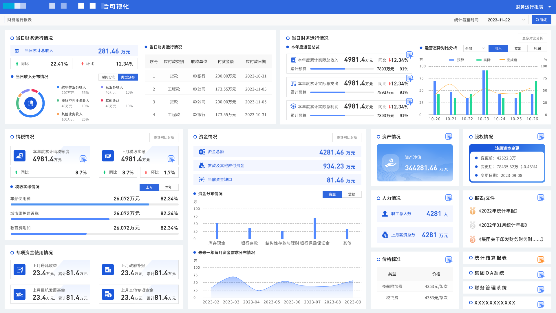 建设机场综合运行场景图,满足对机场整体运行状态监控的需求,可以实时处理和显示航空器、车辆、人员运行轨迹、设施设备的状态、对应管理对象相关信息的综合、对机场运行态势的实时的综合分析、预测和预警。基于 ADW,实现对数据仓库中数据的统计,结合民航局颁发的《中国民用航空统计管理办法》完成机场生产运营管理的统计报表,类型包括:航空安全报表、生产报表、服务质量报表、固定资产投资报表、人力资源报表、财务报表等。
