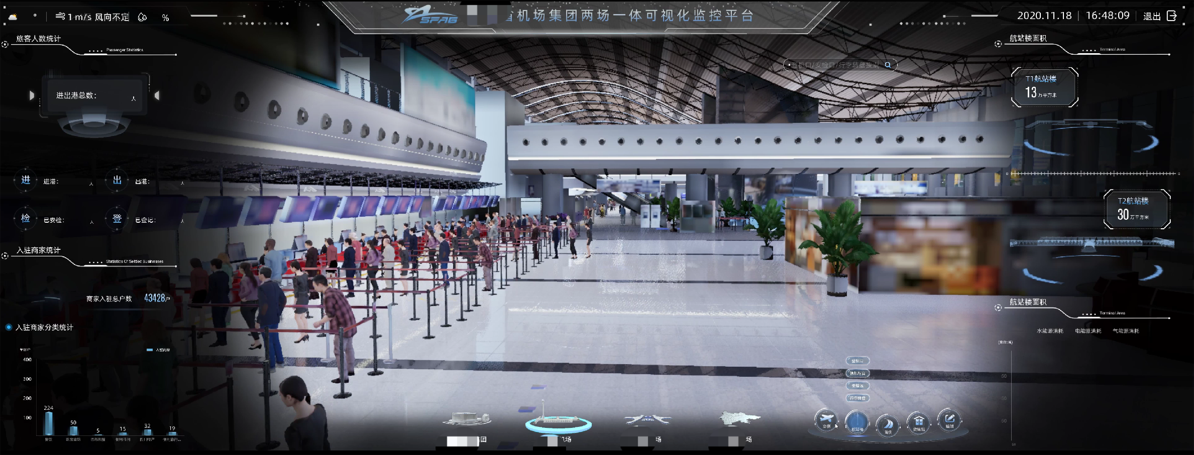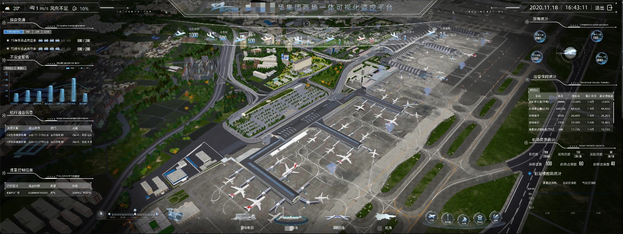 建设符合机场集团特点的两场一体可视化监控平台,顺利获得大数据、物联传感、虚拟仿真、数字孪生等技术,实现对机场的人员、飞机、设备的智慧化、精细化、科学化管理,提升运营效率、管理层次和决策能力,满足对机场的整体管控。