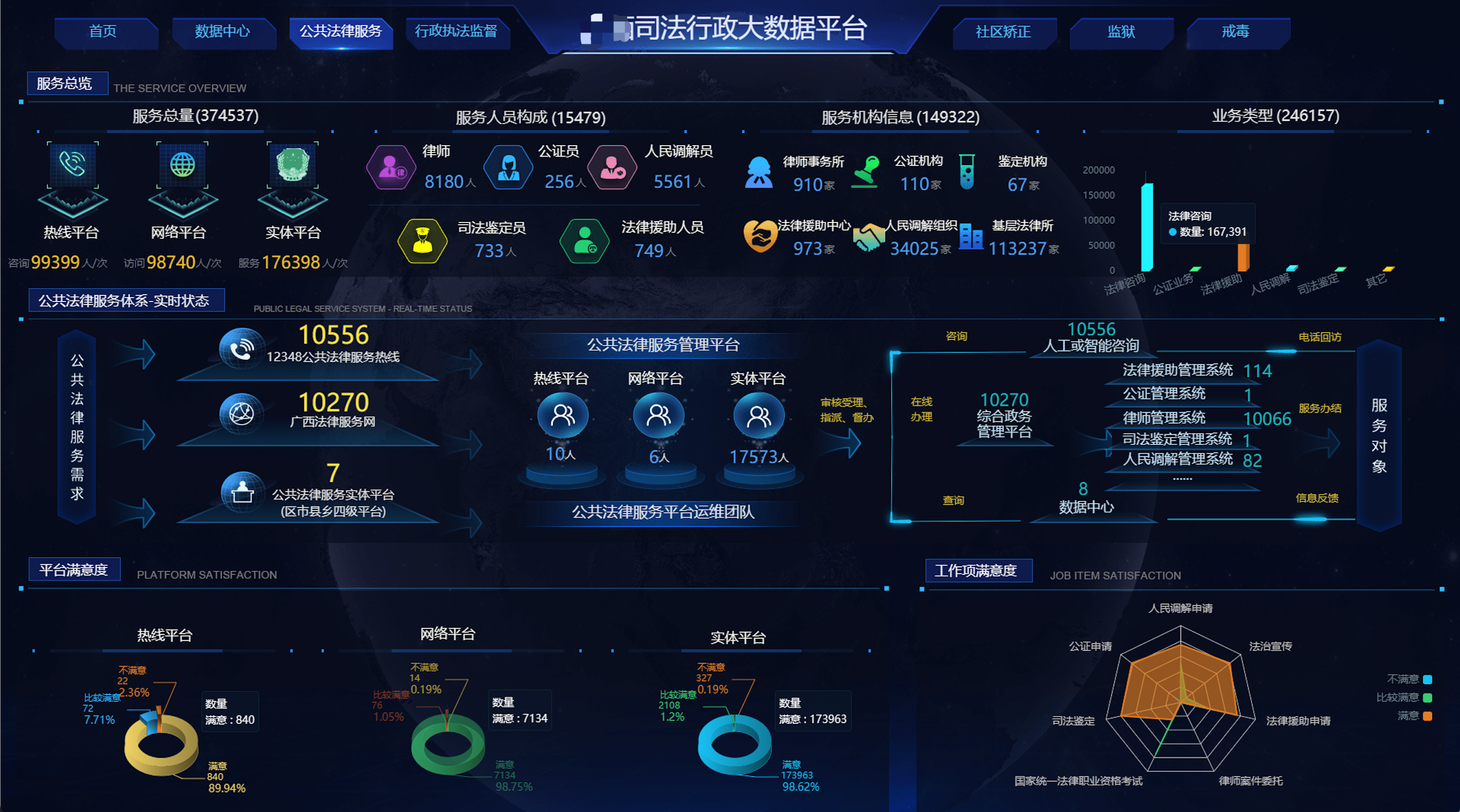 整合了现有各业务线条,形成各业务数据库、业务专题库、业务模型库,建立起全省/全市司法行政大数据中心。同时运用大数据挖掘、分析能力,可为全省/全市司法行政系统以及群众给予决策支撑、研判分析、预警预测服务、公共法律服务能力。